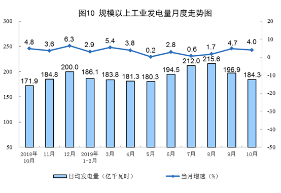 分品種看,10月份火電生產增速略有放緩,水電降幅擴大,核電、太陽能發電回落,風電由負轉正。其中,火電同比增長5.9%,增速比上月放緩0.1個百分點;水電下降4.1%,降幅擴大3.0個百分點;核電、太陽能發電分別增長5.4%和3.0%,分別回落12.5和16.4個百分點;風電增長10.0%,上月下降7.9%。