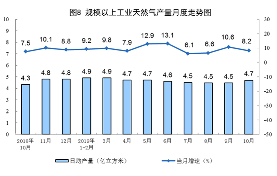 10月份,天然氣生產146億立方米,同比增長8.2%,增速比上月放緩2.4個百分點;日均產量4.7億立方米,環比增加0.2億立方米。1—10月份,天然氣生產1423億立方米,同比增長9.3%。