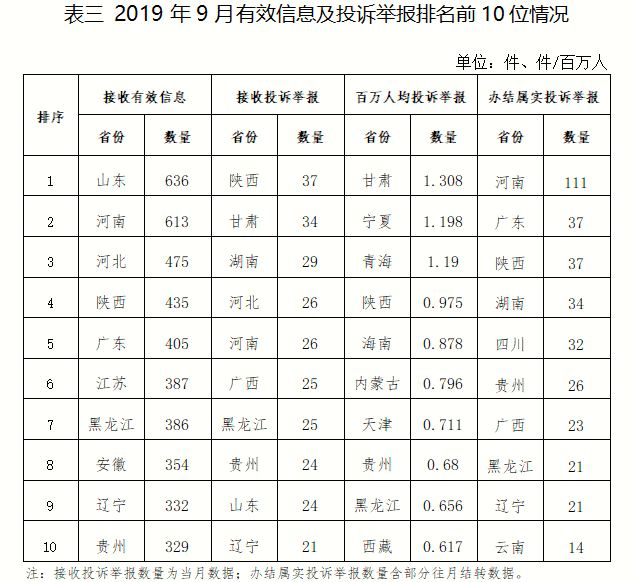 各?。ㄗ灾螀^(qū)、直轄市)按照收到的有效信息數(shù)量排序,山東、河南、河北、陜西、廣東等排在全國(guó)前10位;按照投訴舉報(bào)數(shù)量排序,陜西、甘肅、湖南、河北、河南等排在全國(guó)前10位。按照百萬(wàn)人均投訴舉報(bào)數(shù)量排序,甘肅,寧夏,青海,陜西,海南等排在全國(guó)前10位。按照辦結(jié)屬實(shí)投訴舉報(bào)數(shù)量排序,河南、廣東、陜西、湖南、四川等排在全國(guó)前10位。(2019年9月有效信息及投訴舉報(bào)排名前10位情況見(jiàn)表三)
