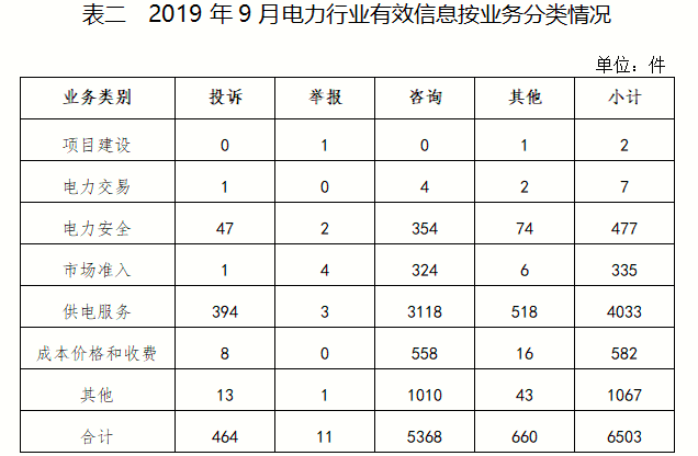 電力行業(yè)排在首位,有效信息數(shù)量為6503件,占全部有效信息的77.62%;其中受理的投訴舉報(bào)數(shù)量為475件,占全部投訴舉報(bào)數(shù)量的94.81%。群眾反映的問(wèn)題主要集中在供電服務(wù)、電力安全、成本價(jià)格和收費(fèi)等方面。(2019年9月電力行業(yè)有效信息按業(yè)務(wù)分類(lèi)情況見(jiàn)表二)