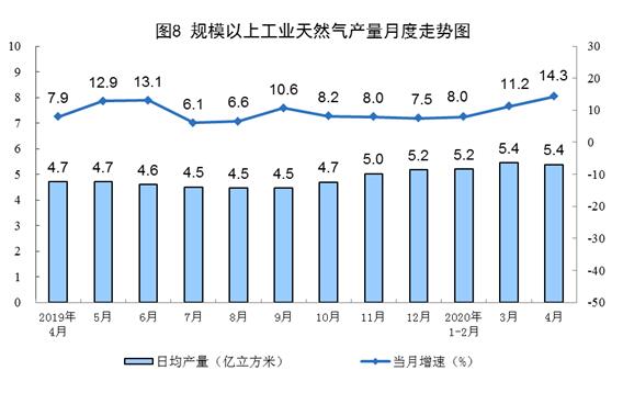 天然氣生產加快。4月份,生產天然氣161億立方米,同比增長14.3%,增速比上月加快3.1個百分點,日均產量5.4億立方米。1—4月份,生產天然氣644億立方米,同比增長10.3%。