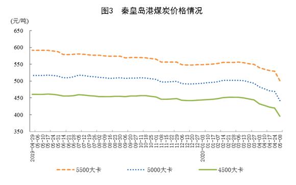 煤炭進口增長較快,交易價格有所下跌。4月份,進口煤炭3095萬噸,同比增長22.3%;1—4月份,進口煤炭1.3億噸,同比增長26.9%。港口煤炭綜合交易價格繼續下跌,5月8日秦皇島港5500、5000和4500大卡煤炭價格分別為每噸501元、442元和396元,比4月3日分別下跌39元、41元和36元。