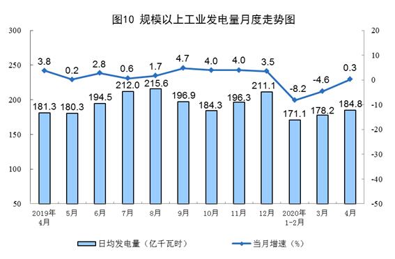 電力生產由降轉增。4月份,發電量5543億千瓦時,同比增長0.3%,上月為下降4.6%,日均發電量184.8億千瓦時,環比增加6.6億千瓦時。1—4月份,發電量21388億千瓦時,同比下降5.0%。