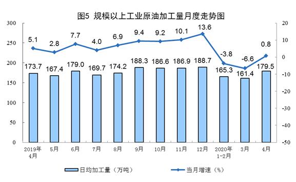 原油生產平穩,加工量由降轉增。4月份,生產原油1587萬噸,同比增長0.9%,增速由負轉正,上月為下降0.1%,日均產量52.9萬噸;加工原油5385萬噸,同比增長0.8%,上月為下降6.6%,日均加工179.5萬噸。1—4月份,生產原油6444萬噸,同比增長2.0%;加工原油20348萬噸,同比下降3.4%。