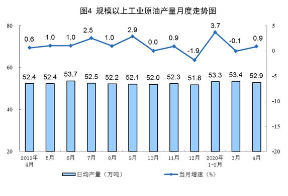 4月份,規模以上工業原煤生產保持較快增長,原油、電力生產由降轉增,天然氣生產加快。