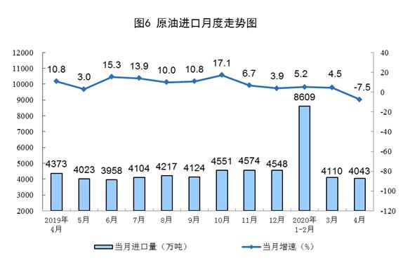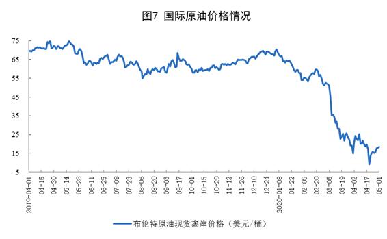 原油進口下降,國際原油價格低位震蕩。4月份,進口原油4043萬噸,同比下降7.5%。1—4月份,進口原油16761萬噸,同比增長1.7%。4月30日布倫特原油現貨離岸價格為18.11美元/桶,比3月31日的14.85美元/桶上漲22.0%。