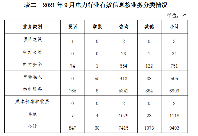 2021年9月,國家能源局12398能源監(jiān)管熱線(以下簡稱12398熱線)共收到有效信息12293件(包含投訴、舉報、咨詢和其他訴求類別),環(huán)比減少1.54%,同比增加19.66%。(2021年9月收到有效信息情況見表一)
