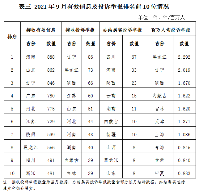 各省(自治區(qū)、直轄市)按照接收的有效信息數量排序,河南、山東、遼寧、廣東、河北、江蘇、陜西、黑龍江、四川、浙江列全國前10位;按照接收的投訴舉報數量排序,遼寧、黑龍江、陜西、江蘇、山東、河北、河南、湖南、內蒙古、吉林排在全國前10位;按照辦結屬實的投訴舉報數量排序,四川、河南、陜西、云南、湖南、內蒙古、新疆、山西、黑龍江、山東排在全國前10位;按照百萬人均投訴舉報數量排序,黑龍江、遼寧、陜西、內蒙古、吉林、天津、上海、青海、甘肅、寧夏排在全國前10位。(2021年9月有效信息及投訴舉報排名前10位情況見表三)
