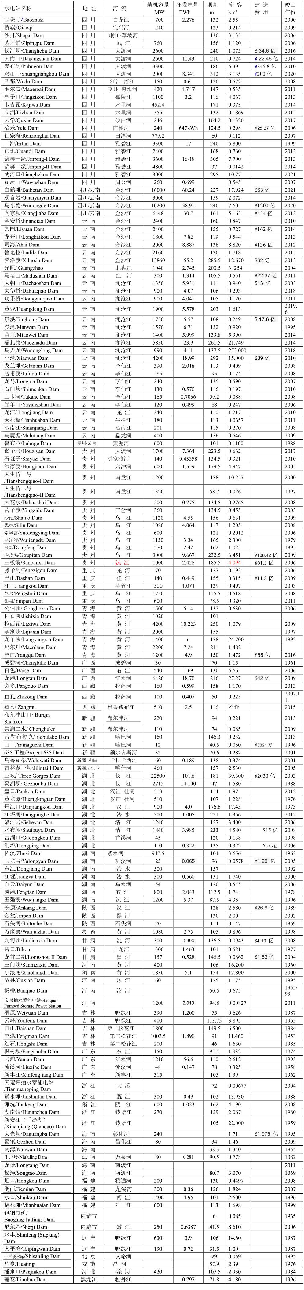 以下是中國正在運營和在建的水壩和水庫的部分清單。由于國內外的電力單位表述單位不一樣,本文的單位換算如下: