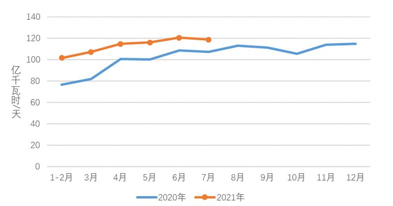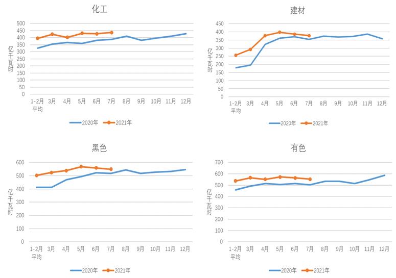 1-7月,化工行業用電量2911億千瓦時,同比增長11.4%,增速比上年同期提高14.2個百分點;建材行業用電量2343億千瓦時,同比增長17.1%,增速比上年同期提高19.5個百分點;黑色金屬冶煉行業用電量3749億千瓦時,同比增長14.5%,增速比上年同期提高14.2個百分點;有色金屬冶煉行業用電量3880億千瓦時,同比增長9.0%,增速比上年同期提高6.9個百分點。