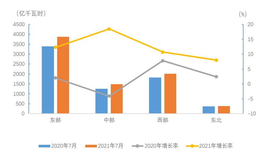 7月份,東、中、西部和東北地區全社會用電量增速分別為12.3%、18.5%、10.7%和8.0%。