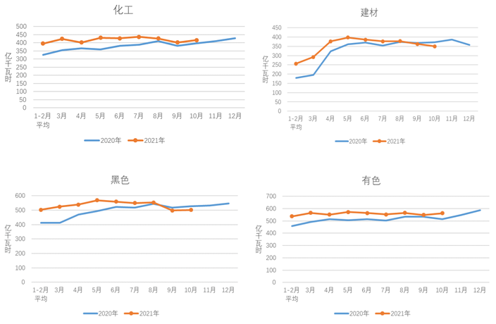 1-10月,化工行業用電量4156億千瓦時,同比增長8.1%,增速比上年同期提高7.7個百分點;建材行業用電量3434億千瓦時,同比增長10.0%,增速比上年同期提高7.5個百分點;黑色金屬冶煉行業用電量5302億千瓦時,同比增長8.8%,增速比上年同期提高5.6個百分點;有色金屬冶煉行業用電量5558億千瓦時,同比增長7.2%,增速比上年同期提高3.6個百分點。