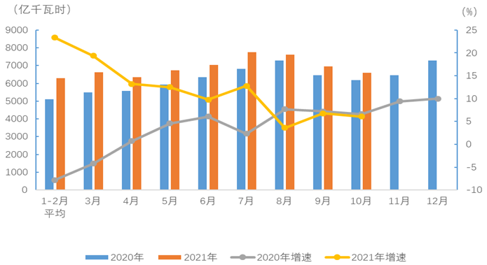 1-10月,全國全社會用電量68254億千瓦時,同比增長12.2%,其中,10月份全國全社會用電量6603億千瓦時,同比增長6.1%。