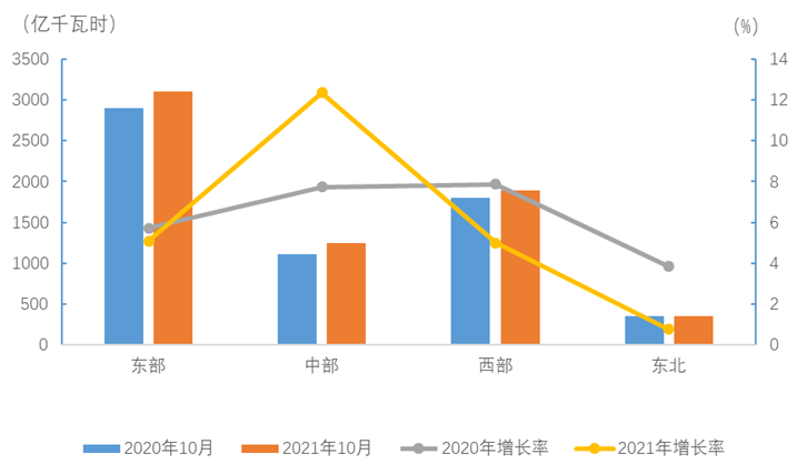 10月份,東、中、西部和東北地區全社會用電量增速分別為5.1%、12.3%、5.0%和0.8%。