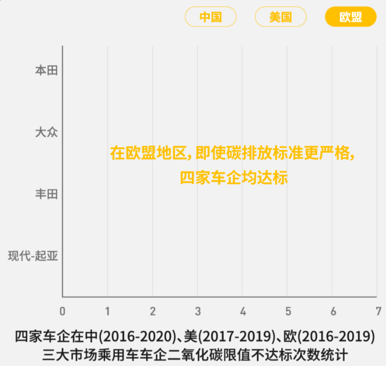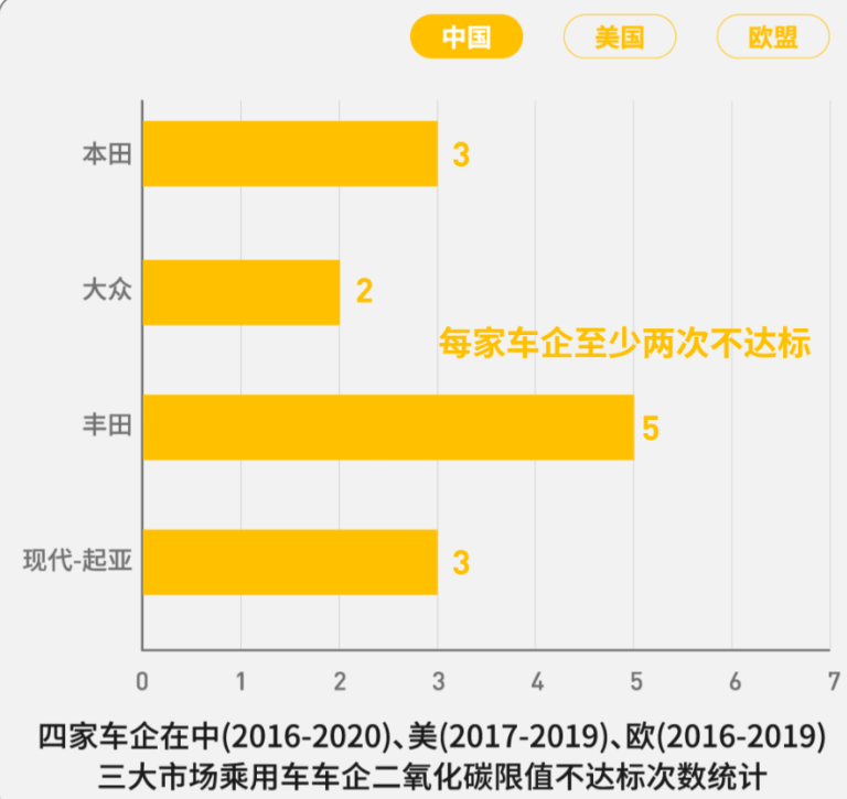 報告數據顯示,2016-2020年間,四家車企在中國均至少有兩次不達標,其中豐田五次不達標,本田與現代-起亞三次不達標,大眾則有兩次。