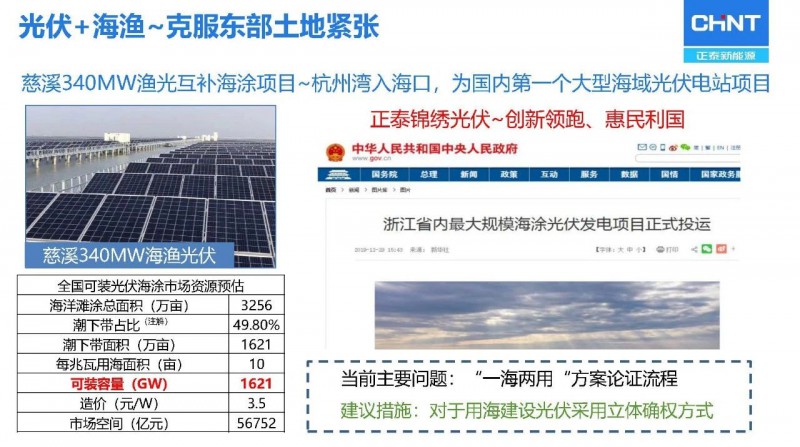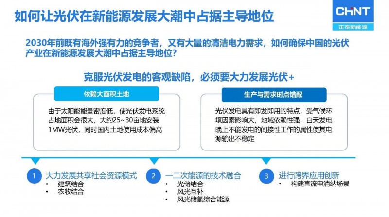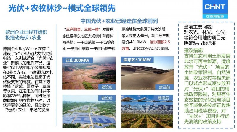 2021年2月3日,由中國光伏行業協會主辦的“光伏行業2020年發展回顧與2021年形勢展望網絡研討會”上,浙江正泰新能源開發有限公司總裁陸川針對我國目前光伏+融合發展模式趨勢進行了分析。我國已經走在了全球光伏+農業行業的前列,針對農光互補電站,他希望能夠推動自上而下的關于農光互補設施正常補償機制的兌現以促進行業更優發展。光伏+海漁的合作方式適用于我國東南海岸,克服了東部土地緊張,不但能夠產生發電效益,同時還能產生漁業收益。光伏+儲能、光伏+風電、光伏+制氫等均為我國光伏應用新模式做出突出貢獻。戶用光伏的智能化應用、光伏+信號基站的互補應用、光伏+交通實現綠電出行等跨界創新的光伏應用模式也將逐漸推廣,實現全社會層面的綠電應用。