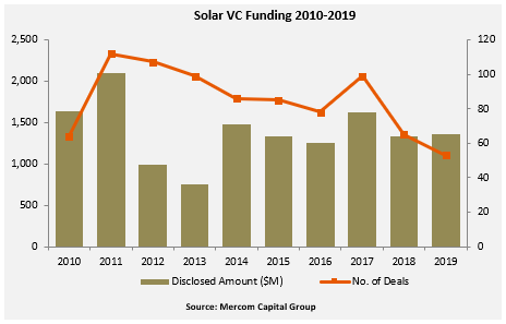 2019年太陽能行業的全球風險投資和私募股權融資(VC / PE)共計53筆交易,達到14億美元,而2018年的65筆交易為13億美元。