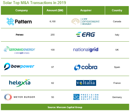 2019年,太陽能領域有65項并購交易,而2018年為82宗。大多數交易涉及太陽能下游企業。2019年,BayWa,EDF可再生能源和Engie均收購了兩家公司。 2019年最大的一筆交易是加拿大退休金計劃投資委員會(CPPIB)以61億美元收購Pattern Energy的交易。