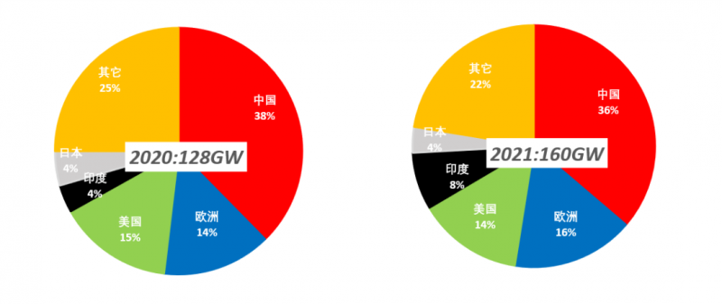 2021年光伏裝機量的增長主要來源于幾大傳統太陽能市場:中國/美國/歐洲/印度