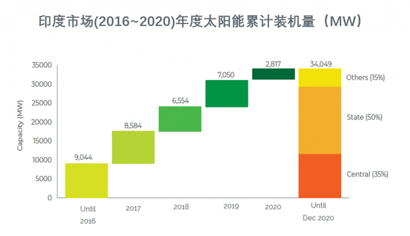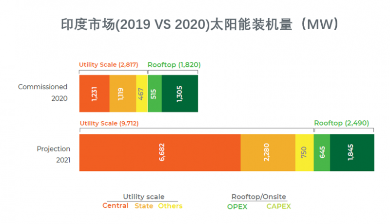 2020年,印度新增了約2.8 GW的公用事業規模太陽能裝機容量和1.8 GW的屋頂太陽能容量,較2019年下降了65%