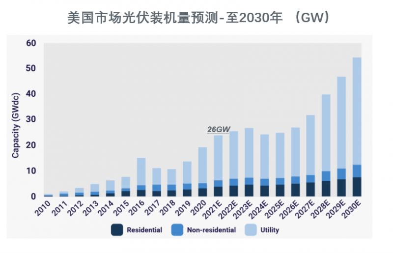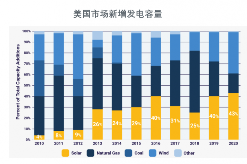 2020年,美國太陽能新增裝機較2019年增長了43%,裝機量達到了19.2GW,突破了歷史記錄