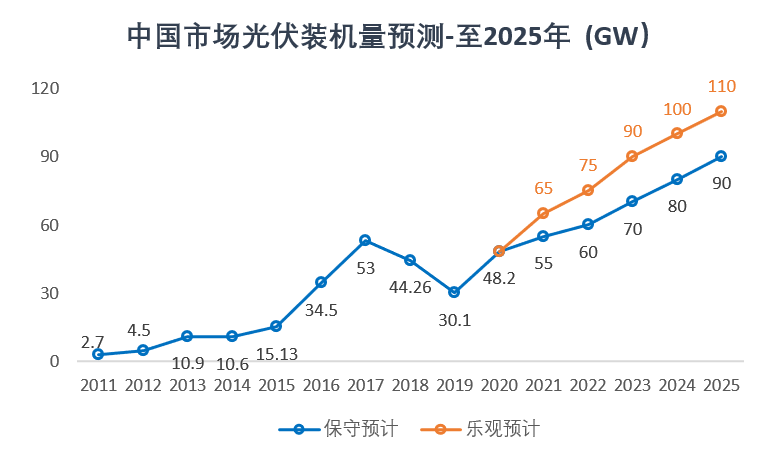 2021年將是中國“十四五”規劃開始實施的第一年,市場對于光伏裝機量的預測較為樂觀,預計2021全年裝機量將超過55GW