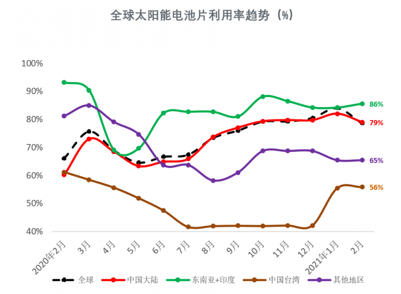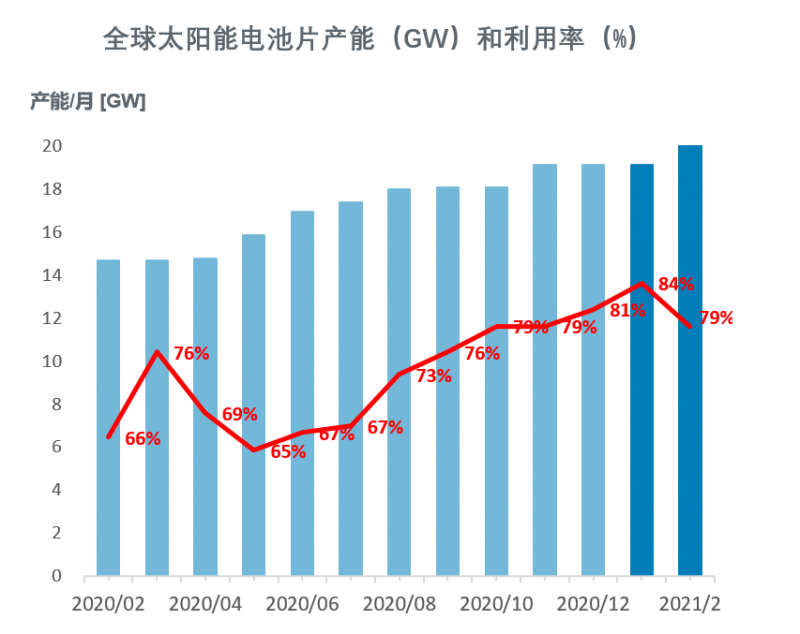 2021年2月,由于中國市場經歷了春節假期,全球及中國大陸地區電池片產能利用率下降至79%