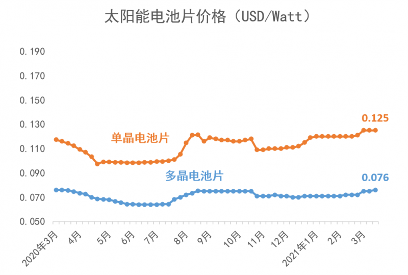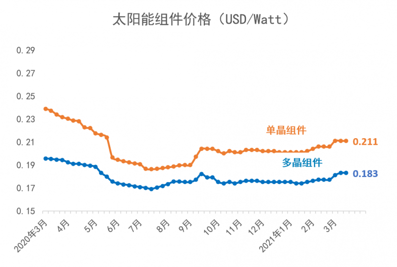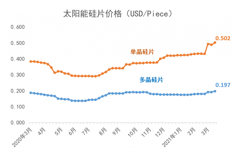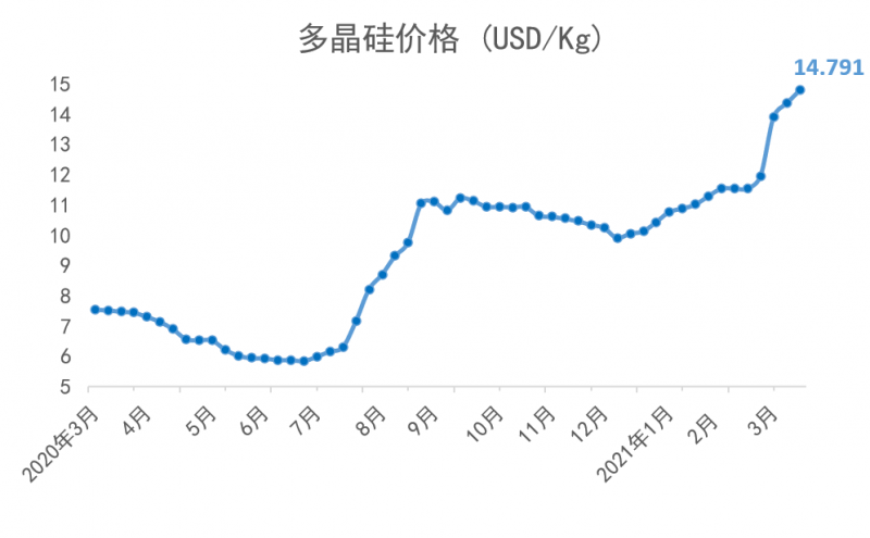從2021年年初開始,多晶硅短缺的狀況持續加劇。2021年3月,歷經了傳統的春節假期之后,上游多晶硅環節更加供不應求,目前的價格相比于2021年1月6日的價格已上漲了41%;同時,由于上游多晶用料呈現價格上漲,硅片端的價格同時跳漲。