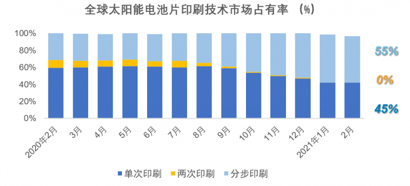 2021年1月,分步印刷技術的全球市場份額占比穩定,保持市場主流地位