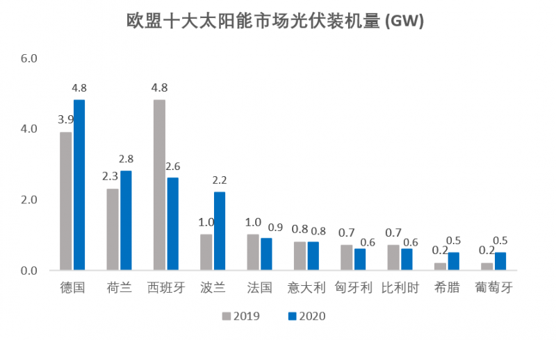 德國依然是歐洲最大的太陽能裝機市場,2020年的光伏裝機量達到了4.8GW,而西班牙的光伏裝機量則由于新冠疫情下的封城影響呈現了大幅下降狀態