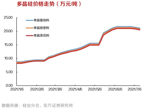 或許是在大擴(kuò)產(chǎn)的預(yù)期下,近期硅料普遍價(jià)格由大漲轉(zhuǎn)向松動(dòng)。根據(jù)硅業(yè)分會(huì)數(shù)據(jù),上周國內(nèi)單晶復(fù)投料成交均價(jià)下滑至 20.81 萬元/噸,周環(huán)比降幅為 1.61%;單晶致密料成交均價(jià)下滑至 20.6 萬元/噸,周環(huán)比降幅為 1.06%;單晶菜花料成交均價(jià)下滑至 20.35 萬元/噸,周環(huán)比降幅 0.73%。