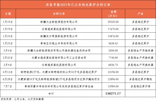與此同時(shí),國內(nèi)多晶硅還原爐市占率第一、該細(xì)分領(lǐng)域絕對(duì)龍頭的雙良節(jié)能也受益頗豐(還原爐是生產(chǎn)多晶硅的重要設(shè)備),近三年來累計(jì)為行業(yè)各家硅料企業(yè)提供三百多臺(tái)大型高效還原爐。據(jù)公告統(tǒng)計(jì),2021年以來公司已簽訂的多晶硅還原爐項(xiàng)目已高達(dá)15.02億元,相比2020全年多晶硅還原爐系統(tǒng)實(shí)現(xiàn)的1.77億元收入,大幅增長748.59%。