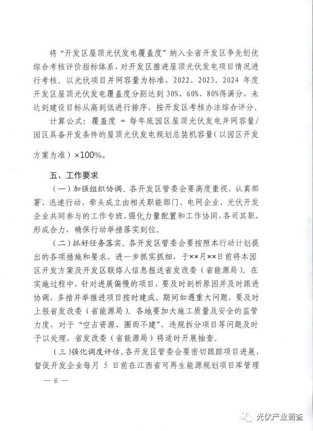 力爭(zhēng)到2022年底,實(shí)現(xiàn)全省各開(kāi)發(fā)區(qū)具備開(kāi)發(fā)條件的屋頂光伏發(fā)電覆蓋度達(dá)到30%以上;到2023年底,全省各開(kāi)發(fā)區(qū)具備開(kāi)發(fā)條件的屋頂光伏發(fā)電覆蓋度達(dá)到60%以上;到2024年底,全省各開(kāi)發(fā)區(qū)具備開(kāi)發(fā)條件的屋頂光伏發(fā)電覆蓋度達(dá)到80%以上。