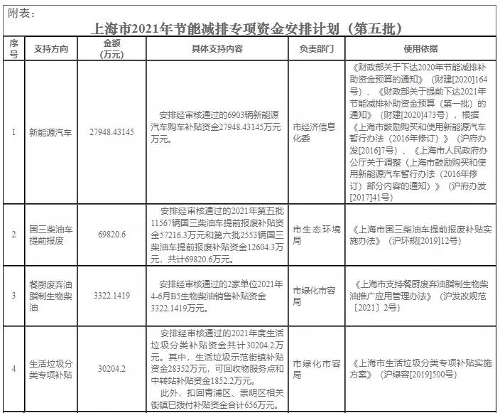 1、按照《財政部關于下達2020年節能減排補助資金預算的通知》(財建[2020]164號)、《財政部關于提前下達2021年節能減排補助資金預算(第一批)的通知》(財建[2020]473號),根據《上海市鼓勵購買和使用新能源汽車暫行辦法(2016年修訂)》(滬府辦發[2016]7號)、《上海市人民政府辦公廳關于調整〈上海市鼓勵購買和使用新能源汽車暫行辦法(2016年修訂)部分內容的通知〉》(滬府辦發[2017]41號)等規定,安排經審核通過的6903輛新能源汽車購車補貼資金27948.43145萬元。