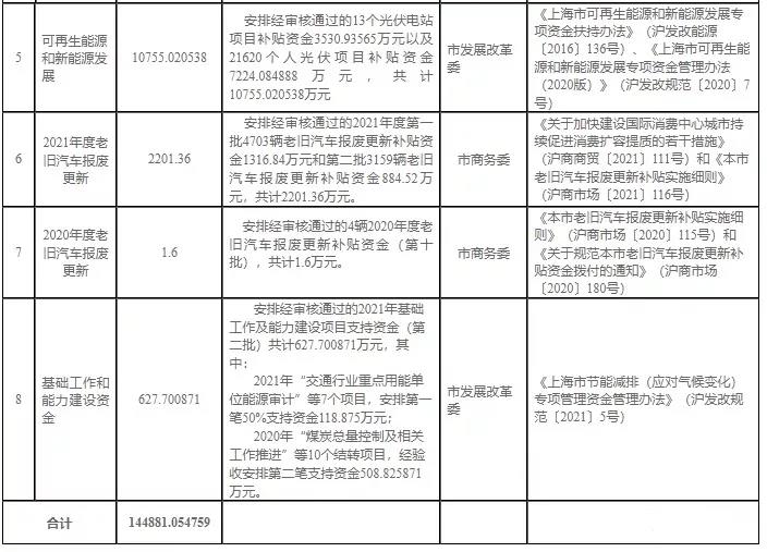 8、按照《上海市節能減排(應對氣候變化)專項管理資金管理辦法(滬發改規范〔2021〕5號)》等規定,安排經審核通過的2021年基礎工作及能力建設項目支持資金(第二批)共計627.700871萬元,其中: