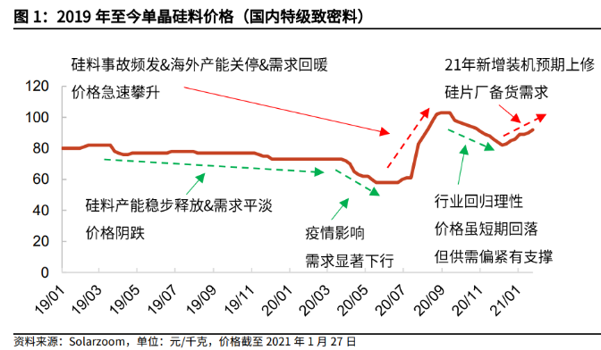 在硅料景氣度高漲的背景下,部分投資者擔心技術的更新迭代(顆粒硅技術)將給硅料生產龍頭公司未來的發展前景帶來不確定性,但是我們認為,當前硅料環節的主要矛盾是2021年供需形式緊張(供不應求)帶來的硅料供應階段性緊缺,這也將推動硅料價格維持高位,甚至在特定時間或特殊因素催化下突破100元/千克的高位,從而保障硅料龍頭企業(通威股份、新特能源、東方希望、大全新能源等)2021年的業績增長和盈利能力維持;技術更新迭代則是當前時點的次要矛盾,FBR顆粒硅技術的確有望成為下一代光伏的硅料技術,但是目前顆粒硅的產能、下游使用占比仍相對較低,需持續關注保利協鑫2021年6月底顆粒硅產能擴產至3萬噸后顆粒硅品質的提升、下游硅片廠商應用、以及成本的降低情況。(文章來源:光大證券)