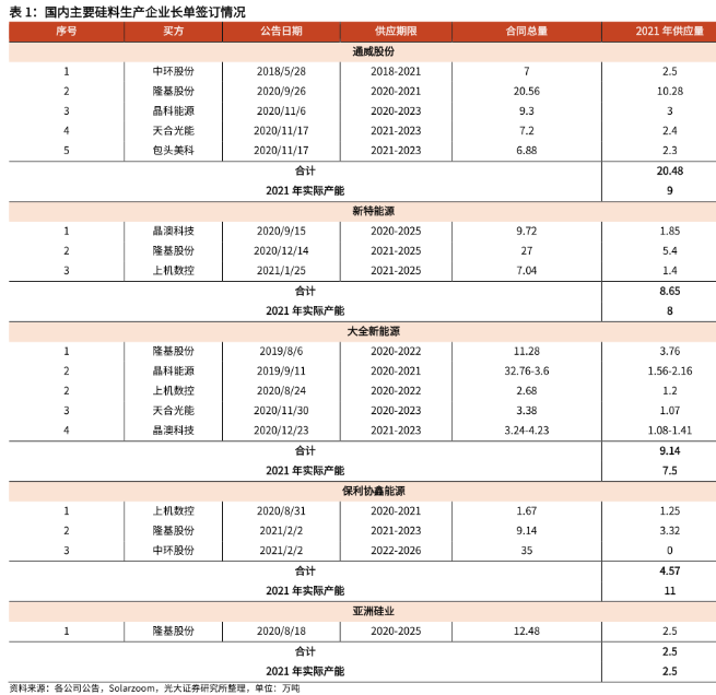 在經歷了19年的硅料產能釋放周期后,2020年我國硅料產能增量有限,且海外OCI先后關停韓國兩家多晶硅工廠(總產能從7.9萬噸滑落至3.2萬噸),2020年國內硅料在產產能從2019年的45.6萬噸小幅提升至48.4萬噸,全球硅料在產產能則從2019年底的62.2萬噸減少1.9萬噸至60.3萬噸。2021年,國內的新產能投放大多集中在Q4,因此對全年的實際產能貢獻有限,預計2021年全球的硅料供應量約為55萬噸,可滿足約170GW的硅片生產需求。與此同時,下游的硅片廠商則在高利潤留存的背景下在2019年開啟了大規模擴產浪潮。2019年在上游環節價格下跌的情況下硅片價格依然堅挺,單晶硅片環節相較其他供應鏈環節仍存在較高的利潤空間,因此各硅片企業均開啟了較為激進的擴張計劃,全國單晶硅片總名義產能從2019年的120GW擴張至2020年的217GW。展望2021年,各大硅片龍頭及二、三線硅片企業仍維持了較大規模的產能擴張節奏,2021年底的單晶硅片名義產能有望再創新高突破300GW。在2021年硅料實際貢獻有限、而硅片產能大幅擴張的背景下,硅片廠商于2020Q3開始密集通過和上游硅料企業簽訂鎖量不鎖價的硅料供貨長協鎖定硅料供應,從而滿足自身的生產需求。根據我們的統計,2021年已有超過80%的硅料產能被長協合同鎖定,主流硅料生產廠商中僅有保利協鑫的部分硅料產能尚未簽訂長協合同。