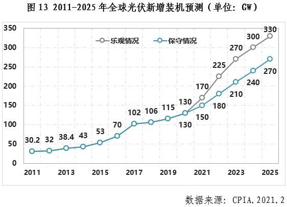 (二)我國光伏市場將進入快速發展新階段2021年是“十四五”規劃的開局之年,也是我國光伏發電進入平價上網的關鍵之年。2021年我國光伏應用市場將繼續保持快速增長勢頭,預計新增裝機規模可達55-65GW,其中競價結轉項目10GW左右,戶用市場有望達到15GW,工商業分布式預計在10GW左右,外送及平價地面電站在20-30GW左右。在“碳達峰、碳中和”目標下, “十四五”期間我國光伏市場將迎來市場化建設高峰,預計國內年均光伏裝機新增規模在70-90GW,有望進一步加速我國能源轉型。