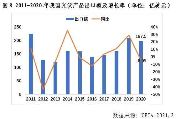 摘要:2020年,受新冠肺炎疫情的影響,全球經濟倒退,然而我國光伏行業逆流而上,取得了令人矚目的成就,保持并延續了多項世界第一。應用市場實現恢復性增長,2020年我國光伏新增裝機48.2GW,連續8年位居全球首位;累計裝機量達到253GW,連續6年位居全球首位;產業規模持續擴大,制造端四個主要環節實現兩位數增長,多晶硅產量39.2萬噸,連續10年位居全球首位;光伏組件產量124.6GW,連續14年位居全球首位;出口市場穩中有升,光伏產品出口額197.5億美元,同比下降5%,但組件出口量則達到78.8GW,創歷史新高,同比增長18.3%。