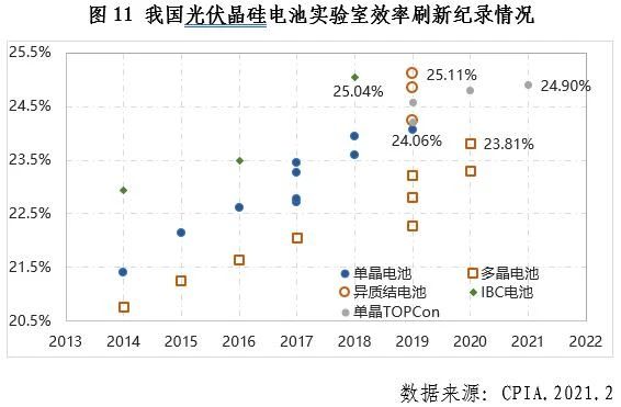 實驗室方面,2020年4月,晶科研發的多晶硅(Multicrystalline)電池片實驗室效率達到23.3%,并被收錄于NREL電池片轉換效率紀錄表中,隨后阿特斯宣布將該效率提高至23.81%。7月,晶科宣布其研發的N型單晶硅單結電池片效率達到24.79%,2021年1月,將該紀錄再次刷新到24.90%,創造了新的大面積N型單晶鈍化接觸電池片效率世界紀錄。我國除了在晶硅電池技術方面領先全球外,鈣鈦礦、有機電池等電池片實驗室效率也走在世界前列,2020年7月,杭州纖納光電以18.04%的鈣鈦礦小組件光電轉換效率的成績,第七次蟬聯了鈣鈦礦小組件世界紀錄榜首。目前NREL電池片轉換效率紀錄表中,除晶科的多晶硅電池片外,上海交大/北航、中科院化學所和漢能分別研發的有機電池、有機疊層電池和薄膜電池仍保持著世界紀錄。