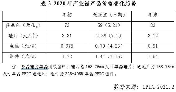 (四)產業鏈供給矛盾突出2020年,光伏產品價格經歷了V字型起伏的過程,光伏產業硅料、玻璃和EVA膠膜等部分原輔材料環節出現的供需緊張也前所未有。上半年,受全球疫情蔓延影響,對下游應用市場未來需求的不確定性導致產業鏈大幅降價,各環節價格降幅均在20%左右。硅料環節,三季度受到事故及自然災害等因素影響供應緊張,8月多晶硅致密料價格由6月的59元/公斤增加至約95元/公斤,漲幅約為60%;四季度隨著新疆地區硅料企業復工,多晶硅價格回落,但仍高于二季度價格低點38%。EVA膠膜的生產設備及原材料EVA粒子可用于防疫物資生產,2020年防疫物資需求暴漲,使得生產設備及EVA粒子供應緊張,膠膜企業擴產受阻延遲,在下半年需求暴漲的情況下,EVA膠膜企業只能通過大幅漲價的方式來獲取EVA粒子資源。下半年EVA膠膜價格上漲了50%,一度達到14元/平方米的高價,和POE膠膜的價格形成了倒掛。下半年需求的集中爆發導致光伏玻璃供給出現巨大缺口,價格快速上漲,年底3.2mm光伏玻璃價格達到了43元/平方米,較5-6月最低時上漲80%,部分企業采用浮法玻璃作為雙面組件的背板玻璃。進入12月,產品價格趨于平緩。但全年來看,除多晶硅價格上漲13.7%以外,硅片、電池、組件產品價格仍分別下降了5.7%、6.7%與10.5%,降本增效發展方向沒有變,長期來看價格依然是下降趨勢。