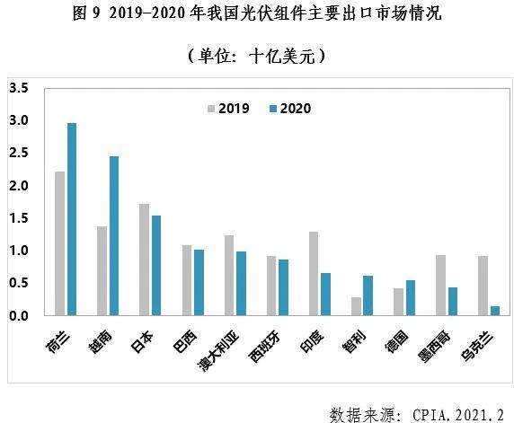 從光伏組件出口市場來看,2020年光伏組件主要出口市場中傳統市場活力不減,其中荷蘭和越南市場份額增長明顯。在光伏發電成本持續降低以及歐盟綠色協議的背景下,歐洲市場保持增長勢頭,荷蘭作為歐洲市場的集散中心出口量持續增長。越南新一輪FIT政策引發了越南屋頂光伏的搶裝熱潮,根據越南工貿部的公告顯示,2020年越南光伏新增裝機為10.75GW,成為全球前3大光伏市場,其中屋頂光伏裝機超過9GW。越南市場新增裝機猛增,對我國組件需求明顯增長,成為第二大光伏組件出口市場。印度市場受疫情影響,市場需求下降較為明顯。曾經的新興市場烏克蘭因其國內電價的下降致使光伏項目的收益有所降低,投資熱情減退,市場需求下降。墨西哥市場受到清潔能源拍賣的取消以及后續政策不確定性的影響未能延續之前的增長勢頭,市場需求有所下降。