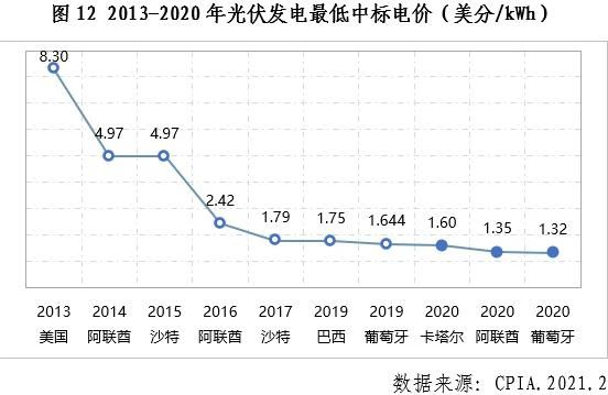 (五)光伏發電電價與成本持續下降2020年,全球光伏發電中標電價繼續下降,僅一年中全球就有三個項目接連創造了最低中標電價。8月,位于葡萄牙一光伏項目中標電價達到了0.0112歐元/kWh(約1.32美分/kWh),折合當時人民幣價格約0.091元/kWh。這一電價比2019年最低中標電價降低了0.324美分/kWh,降幅達到19.7%。2020年,我國光伏發電項目中標電價也刷新最低紀錄,青海海南州一光伏發電競價項目中標電價為0.2427元/kWh(約3.46美分/kWh),低于2019年達拉特旗光伏項目0.26元/kWh的電價。除此之外,卡塔爾、阿聯酋、印度等國光伏中標電價也打破了原來的最低紀錄。光伏發電價格已經在全球越來越多的國家及地區低于火電,成為了最具競爭力的電力產品。