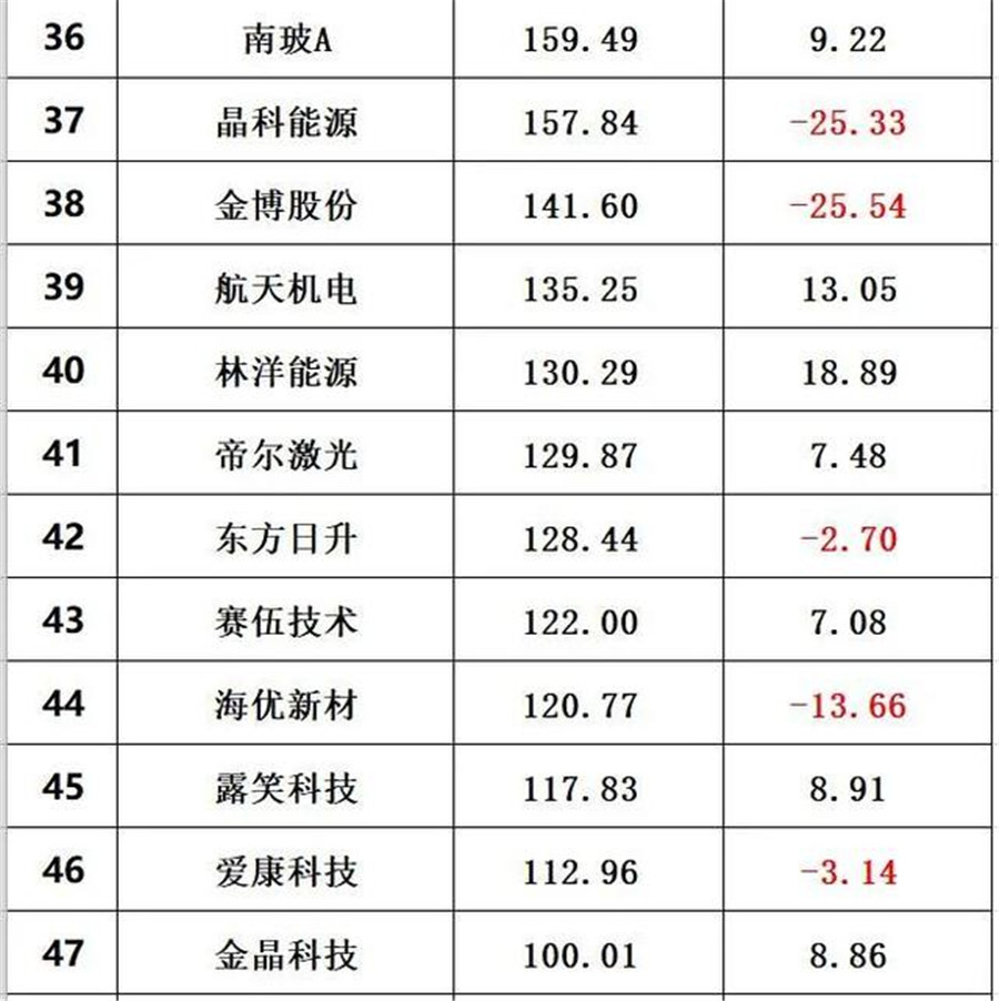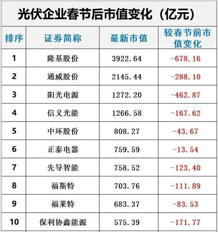 其中隆基股份總市值較春節前下跌678億、通威股份下跌288億、陽光電源跌去462億、信義光能下跌167億、中環股份下跌43億、正泰電器跌去13億、先導智能跌去123億、福斯特跌去111億、福萊特跌去83億、保利協鑫能源跌去171億、晶澳科技跌去97億。