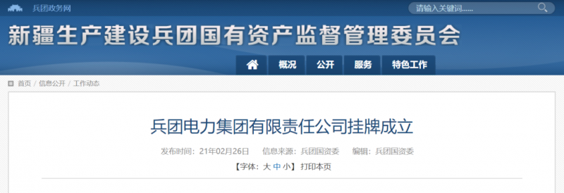 2月26日,從兵團國資委獲悉,新疆生產建設兵團電力集團有限責任公司在烏魯木齊舉行揭牌儀式,宣布正式成立。兵團電力集團有限責任公司是兵團國資國企改革中兵團本級成立的第一個產業集團公司,企業注冊資本金5億元,是新疆電力市場的重要主體和能源產業的新興力量。