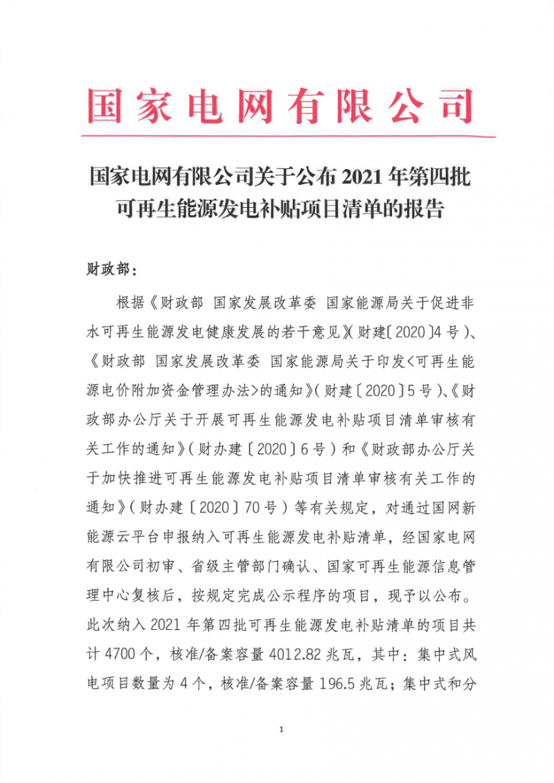 關于公布2021年第四批可再生能源發電補貼項目清單的公告