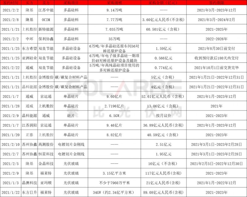硅片方面,通威與京運通、上機數控累計簽訂單晶硅片訂單超12億片;晶科能源向通威采購硅片6.5GW;江蘇潤陽向京運通采購硅片9.46億片;正泰向上機數控采購單晶硅片8.82億片,以上合同采購期限均為2021-2023年。同時,蘇州協鑫與高測股份、恒星科技簽訂總價4.46億元的電鍍切片金剛線采購項目。
