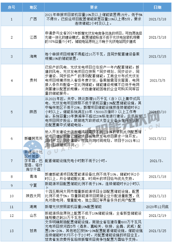就消納掣肘,光伏電站配置儲能成為政策導(dǎo)向。據(jù)北極星太陽能光伏網(wǎng)統(tǒng)計,2021開年以來,廣西、江西、貴州、山東、海南等13個地區(qū)要求風、光項目強配儲能,比例在5%~10%之間,連續(xù)儲能在2小時及以上。然而在儲能經(jīng)濟性仍未達到預(yù)期且獲利商業(yè)模式仍未明朗下,強配儲能對于光伏電站投資業(yè)主來說無疑是雪上加霜。