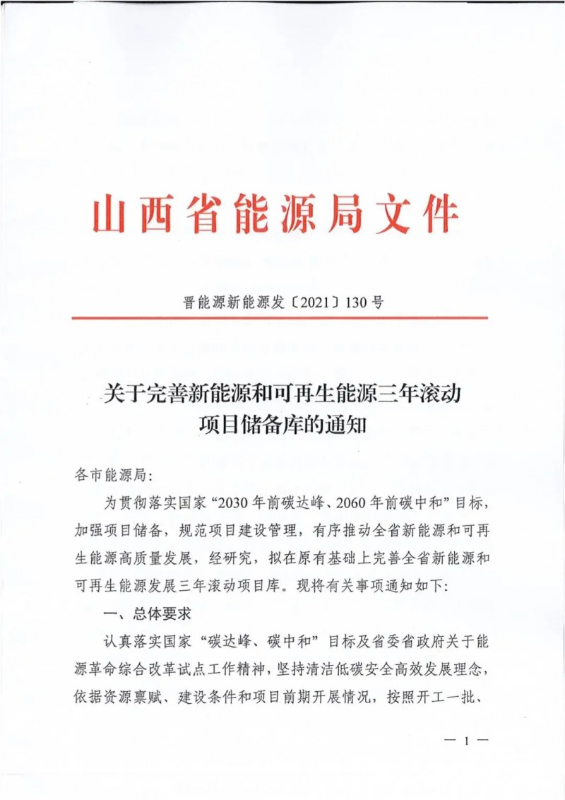 3月26日,山西省能源局印發《關于完善新能源和可再生能源三年滾動項目儲備庫的通知》,就項目規劃、管理、建設方面作出相關指示。