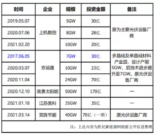京運(yùn)通創(chuàng)立之初,業(yè)務(wù)并未涉及單晶硅業(yè)務(wù),光伏設(shè)備為其主要支撐,與賽維LDK的“糾葛”在業(yè)內(nèi)較為知名。2017年6月5日,京運(yùn)通發(fā)布公告稱,與內(nèi)蒙古烏海市政府簽署了《烏海京運(yùn)通新材料產(chǎn)業(yè)園項目投資協(xié)議》,就建設(shè)設(shè)計5GW多晶硅及單晶硅材料為主的產(chǎn)業(yè)園區(qū)達(dá)成合作意向,總投資約為30億元。后由于技術(shù)進(jìn)步,該項目產(chǎn)能提升至7GW。2020年3月、2020年11月,京運(yùn)通邁出了擴(kuò)產(chǎn)的步伐。從2020年年末至2021年1月,短短20天時間,京運(yùn)通與晶澳、江蘇新潮、通威、江蘇潤陽悅達(dá)簽署高達(dá)168億單晶硅長單。